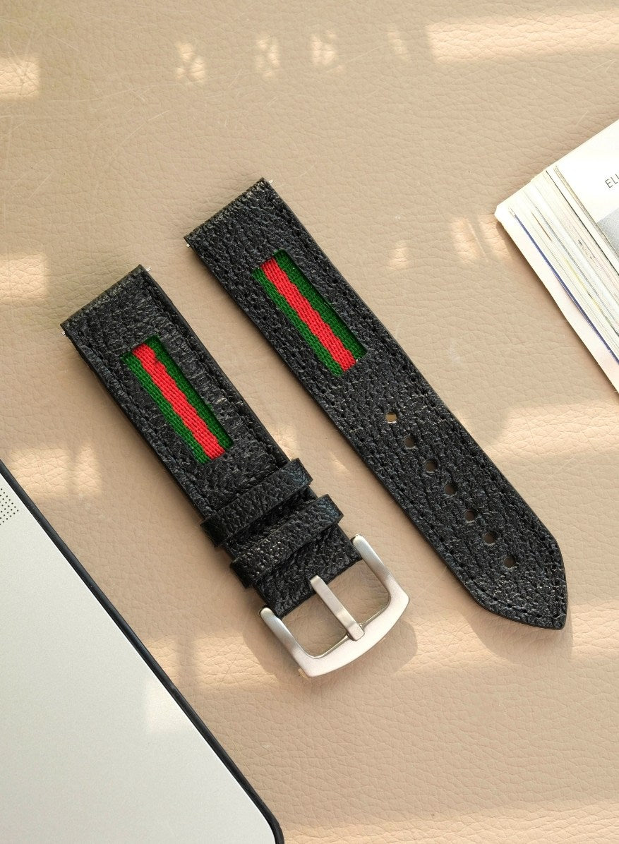 Şerit detayıyla fark yaratır. Saat kordonuna ikonik bir hava katmak isteyenler için ideal bir tercihtir.